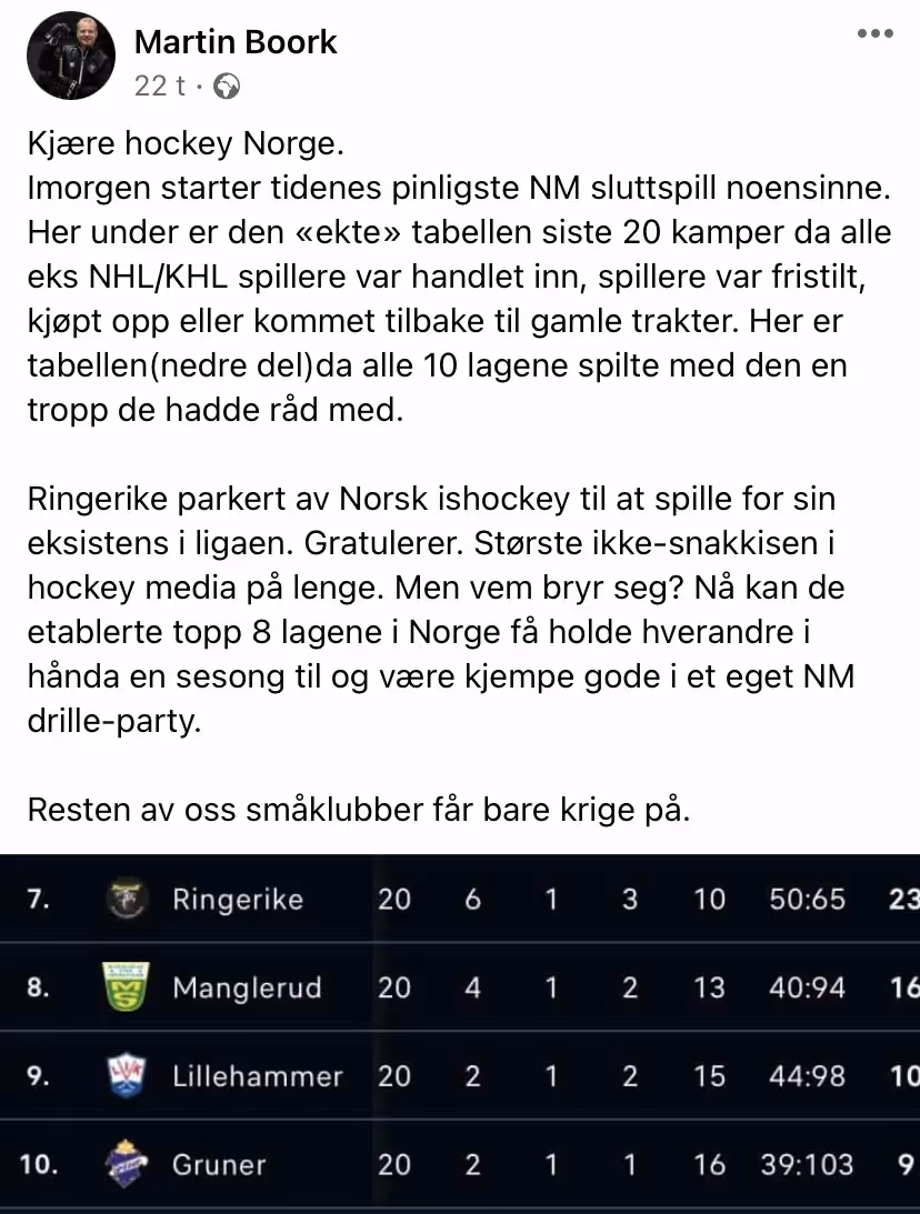 Boork langet ut i et innlegg på sin Facebook-profil torsdag der han også satte opp tabellen basert på de 20 siste kampene. I den perioden har Ringerike plukket over dobbelt så mange poeng som Lillehammer og syv flere enn MS.